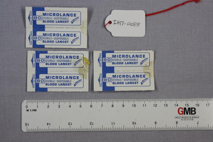 6 lancettes stériles. Sur l’emballage. “Microlance. sterile disposable. Blood lancet.” Fabricant “B-D”