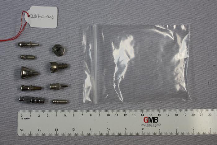 Diverses pièces en métal pour seringue. 8 embouts et 1 piston.
