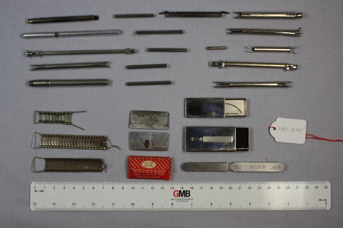 - 2 lames de sûreté forgées dans boîte en carton, fabricant “Jaques Lecoultres & Cie.” - 2 étuis avec aiguilles de suture - 16 étuis pour aiguille - 4 aiguilles pour seringue - 3 lots d’agrafes - 1 “Neoton. Paul Kramer Neuchatel”