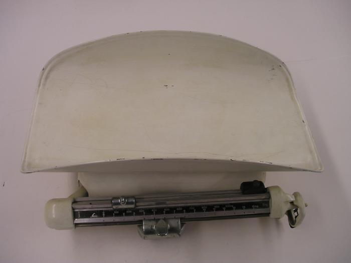 Poire en caoutchouc rouge munie d’un embout noir en bakélite pour douche vaginale ou irrigation;Pèse-bébé en métal ivoire gradué de 0 - 15kg