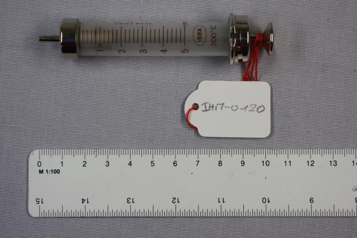Seringue en métal avec réservoir gradué en verre. Fabricant “ISBA, Swiss made”