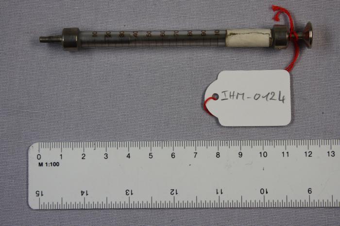 Seringue en métal avec réservoir gradué en verre “Swiss made”. Inscription sur la pompe “Sainteni Ess”