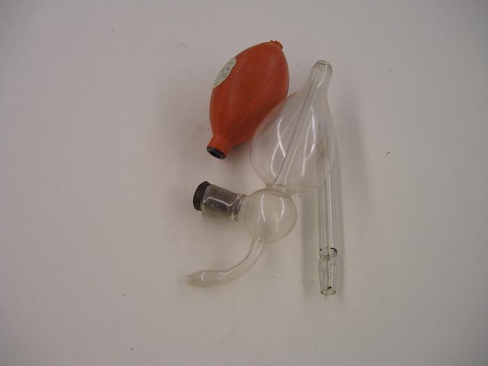 Pièce de verre en forme de boule avec embout de verre et poire de caoutchouc pour l’application vaginale de substances dessicatives dans le but de sécher les muqueuses. Dans boîte en carton.