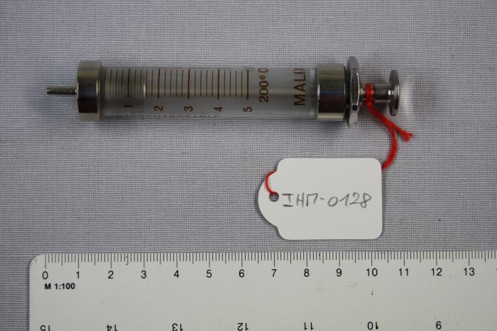 Seringue en métal avec réservoir gradué en verre “MALIX. Swiss made Brev. dép. Interchangeable”