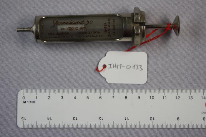 Seringue en métal avec réservoir gradué en verre “Socorex. Swiss made. Standard 50. Sterilisation. Sterilization. Zusammengesetzt. Fully assembled. Interchangeable. Kalibriert”. Sur la pompe “Standard 50”