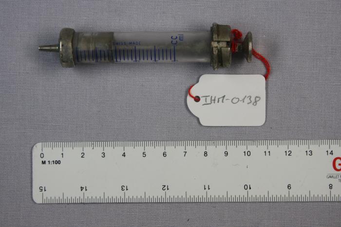 Seringue en métal avec réservoir gradué en verre “Swiss made”.