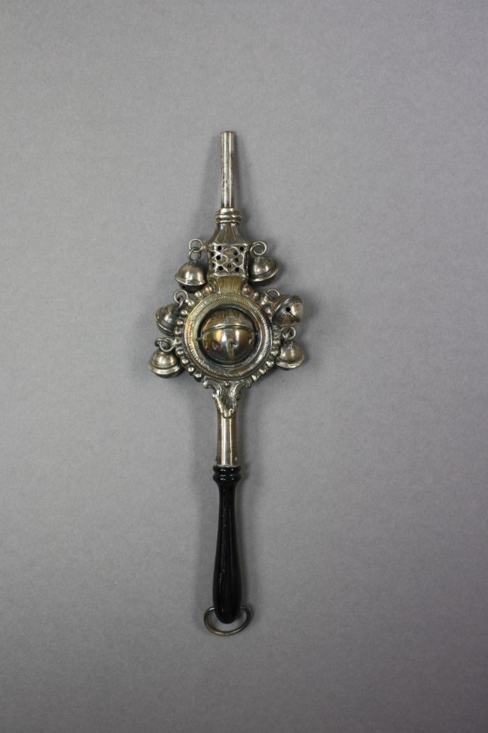 Hochet complexe fait d'un manche en bois peint et des divers éléments en métal: au centre, une sphère striée et poinçonnée tournant sur un axe, fixé sur un cadre circulaire décoré. Y sont attachées 4 clochettes. Le cadre est surmonté d'une pièce creuse, à laquelle sont attachées 2 clochettes, et se termine en sifflet.