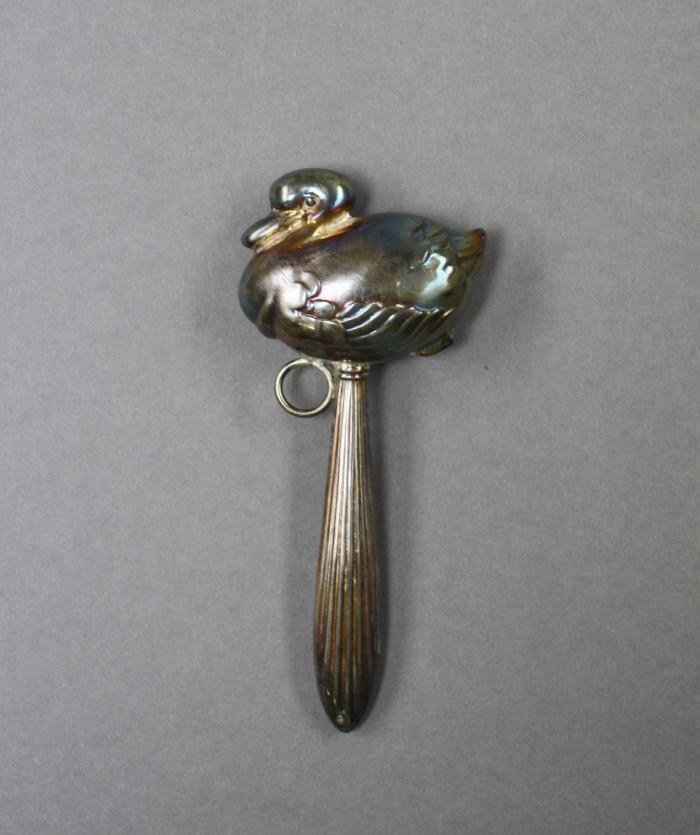 Petit hochet en métal en forme de canard creux et comportant un élément qui produit un son, comme un grelot.
