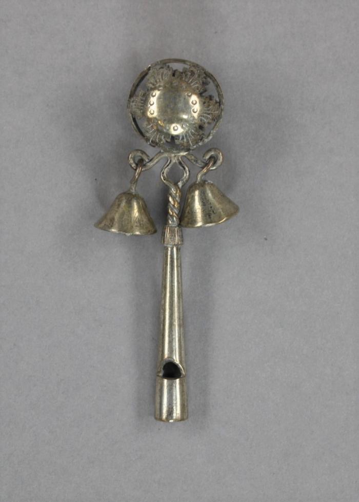 Petit hochet en métal. Le manche creux et biseauté peut servir de sifflet. Il est surmonté d'un grelot en forme de sphère creuse ajourée et ornementée. Deux petites cloches sont attachées sous la sphère.