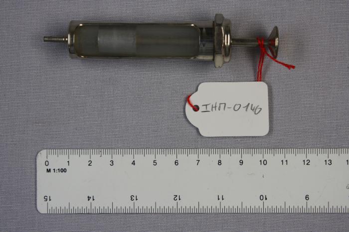 Seringue en métal avec réservoir en verre. Inscription sur la pompe “Standard 50”