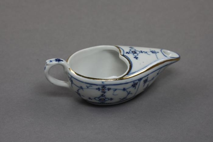 Petit récipient en porcelaine avec une anse et un bec verseur. Décoré de motifs bleus réhaussé de doré. Ce genre d'objet était utilisé pour nourrir les enfants.