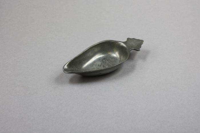 Récipient en métal utilisé pour nourrir les malades ou les enfants. Sur la petite anse plate, inscription 1837.