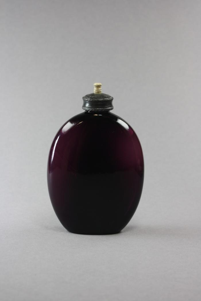 Biberon ovale en verre violet avec embout en étain et ivoire. A l'intérieur se trouve un tube en verre.