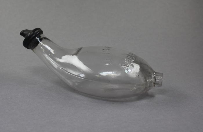 Biberon de forme sabot, goulot et tétine en caoutchouc durci brisée. Ouverture de nettoyage à l'opposé. Inscription sur le corps de la bouteille: LE PARFAIT / NOURRICIER