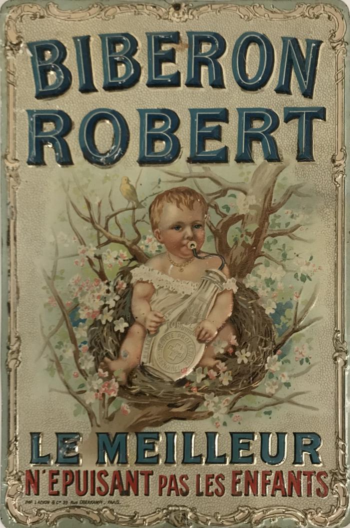 Panneau publicitaire en tôle, peint et bosselé. A l'intérieur d'un cadre ornementé, un bébé est assis au milieu d'un nid fleuri, dans un arbre où se trouve un oiseau. Entre ses bras, il tient un biberon Robert à tube.