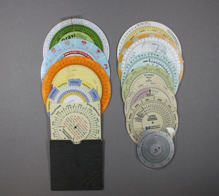 Lot de 12 disques de grossesse, permettant de calculer le terme de la grossesse. Ces disques sont produits par des entreprises pharmaceutiques pour la plupart.