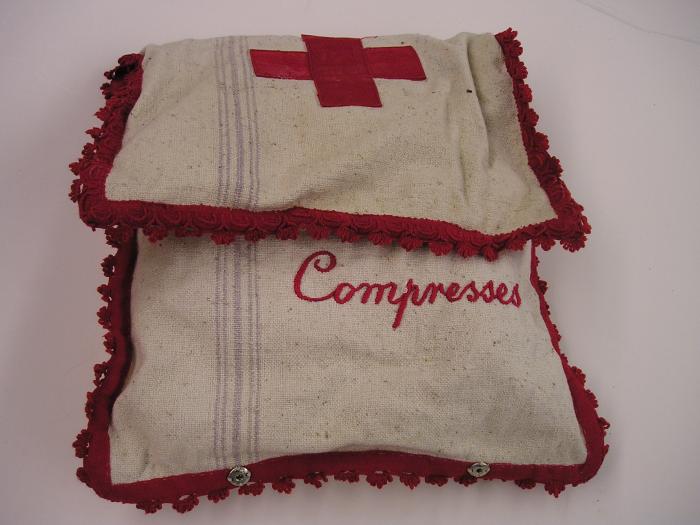 Trousse de coton beige à deux poches internes contenant divers matériel pour bandages: compresses, bandes, ouate.