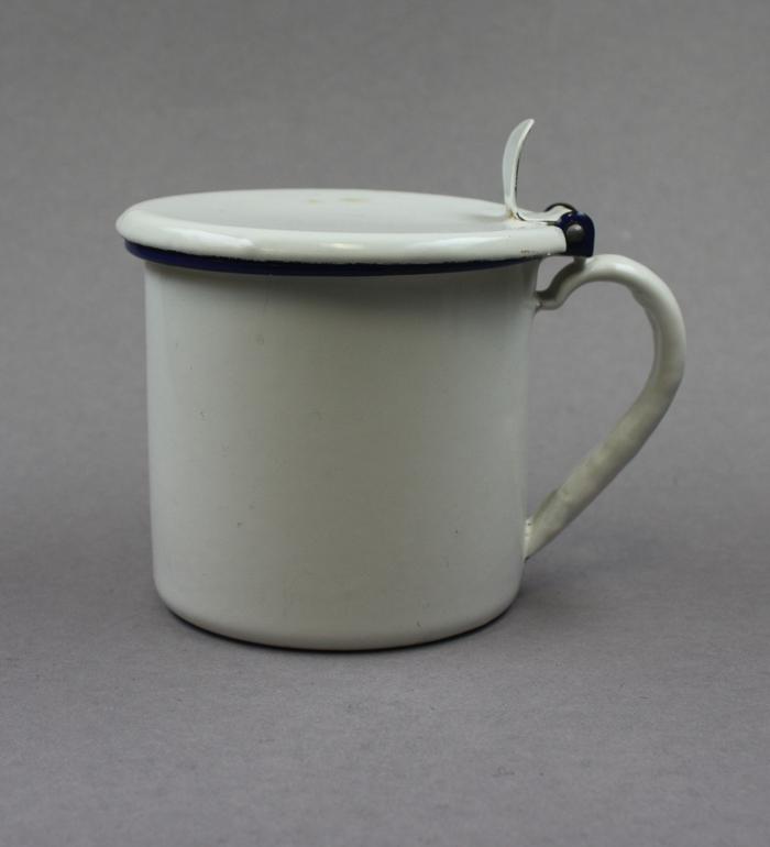 Crachoir en émail blanc et liseré bleu, avec couvercle attaché.