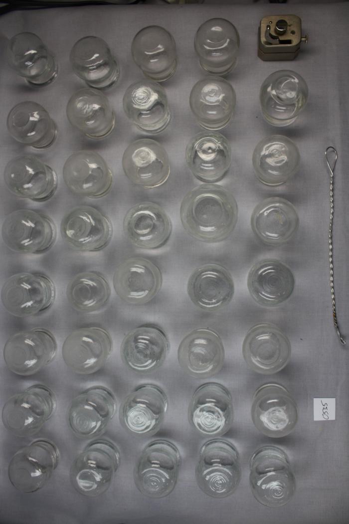 Boîte en métal avec insigne “Hausmann A. G. St. Gallen Basel Davos Genève Zürich”. Un scarificateur à 12 lames 38 ventouses de différentes tailles 1 tige torsadée