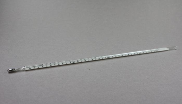 Thermomètre en verre, gradué de zéro a 360 degrés celsius.