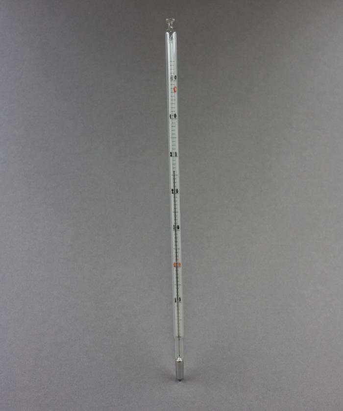 Thermomètre en verre, gradué de -10 a 50 degrés celsius.