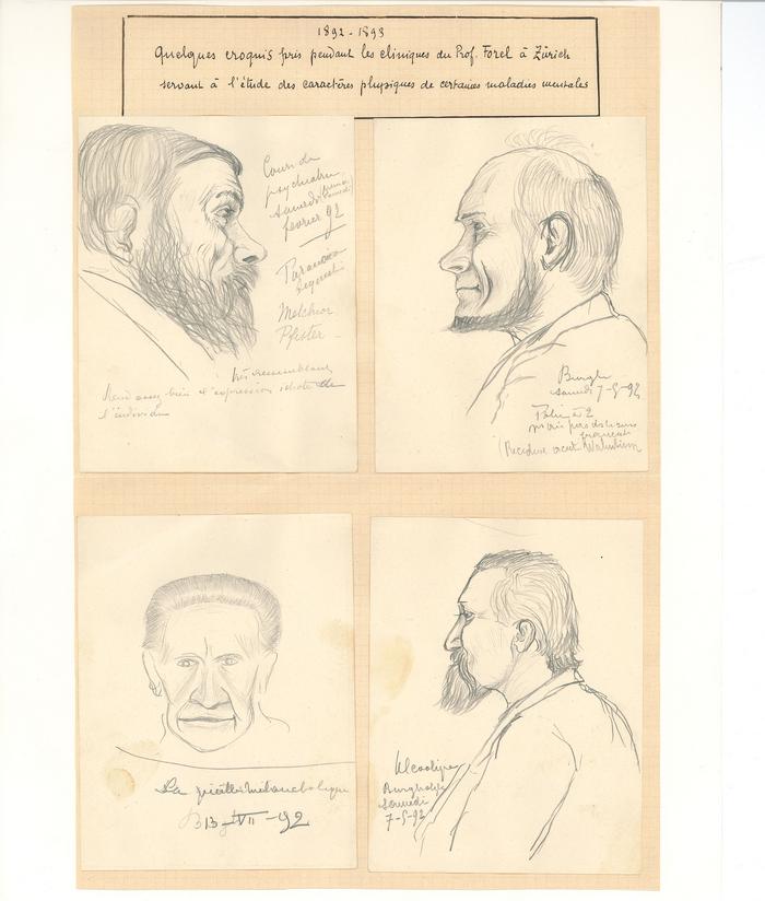 "1892-1893 Quelques croquis pris pendant les cliniques du Prof. Forel à Zürich servant à l'étude des caractères physiques de certaines maladies mentales"
