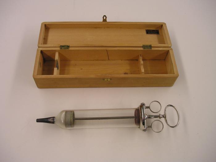 Seringue de 100 ml à cylindre de verre avec embout métal, dans caissette de bois marquée Cezerac & Soux, Marseille.