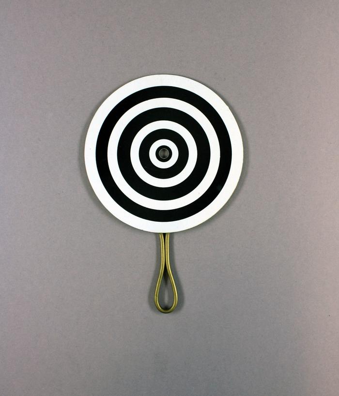 Disque de métal percé en son centre, avec des cercles concentriques noirs et blancs, fixé sur un manche. Le disque de Placido, du nom de son inventeur (Antònio Placido da Costa (1849-1916) médecin ophtalmologue portugais) sert à juger la régularité ou l'irrégularité de la courbure cornéenne.