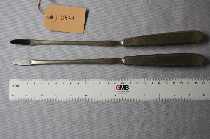 2 bistouris pour ménisque (?) Dans lot “Dr. de Rham” (cf. Lettre à M. Rham, 7 juin 1990)