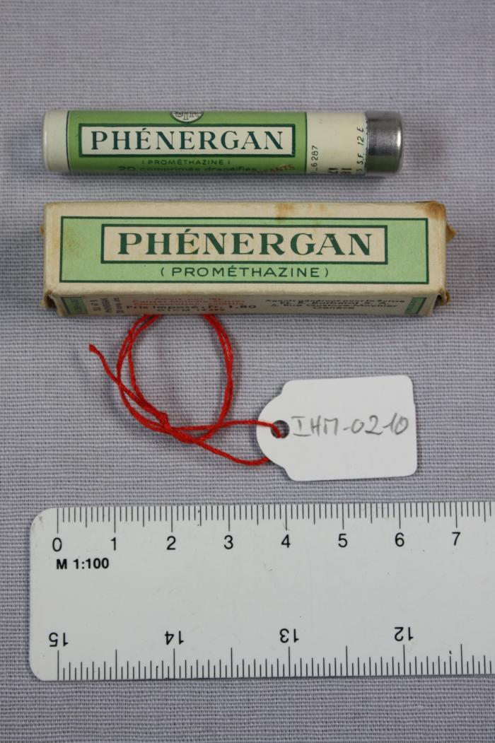 Boîte de 20 comprimés Phénergan (comprimés à l’intérieur), notice d’emballage.