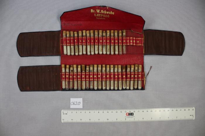 Trousse de pharmacie. Inscription “Dr. W. Schwabe Leipzig Centralhalle.”. 36 tubes. Date de 1867 inscrite sur la trousse, mais probablement fabrication postérieure