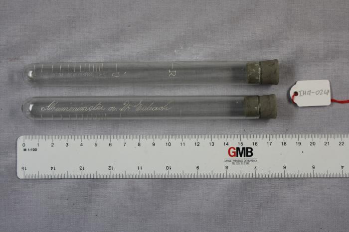 2 éprouvettes graduées. Inscription “Albuminimètre Dr. Esbach” (?) à mettre en rapport avec l’autre albuminimètre dans étui en bois