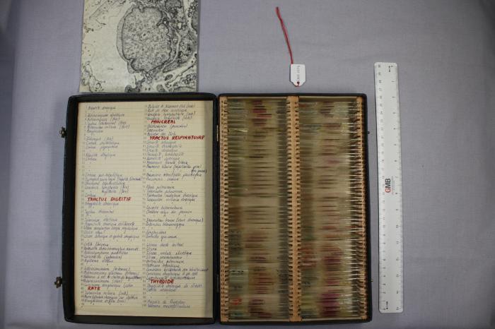 Boîte cartonnée noire et coupes dans plaques en verre, matière organique. 95 coupes sur 100. (cf. Bordereau de versement, 10.10.2011)