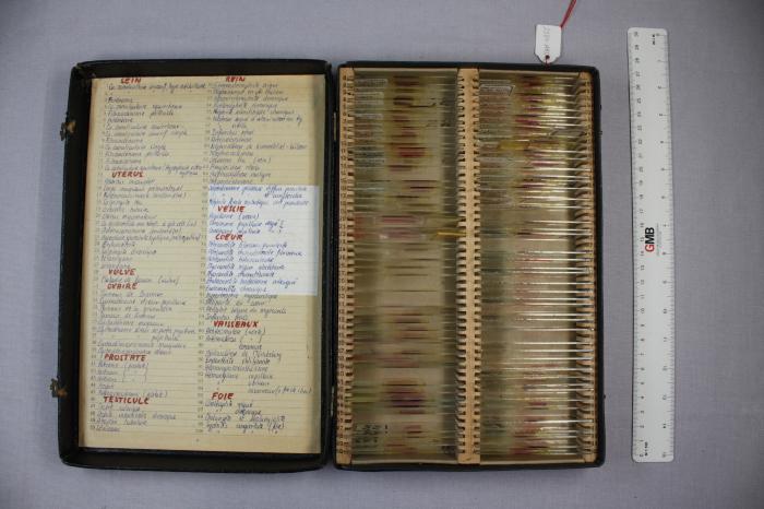 Boîte cartonnée noire et coupes dans plaques en verre, matière organique. 91 coupes sur 100.