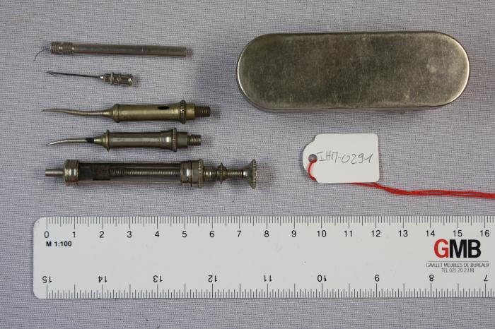 Boîte en métal avec petite seringue, 2 embouts et aiguille. (cf. Bordereau de versement, 3 décembre 2008)