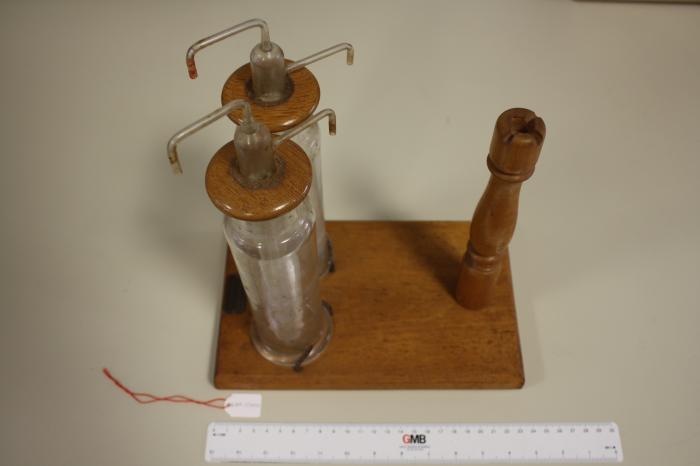 Matériel de laboratoire en bois avec 2 flacons en verre.