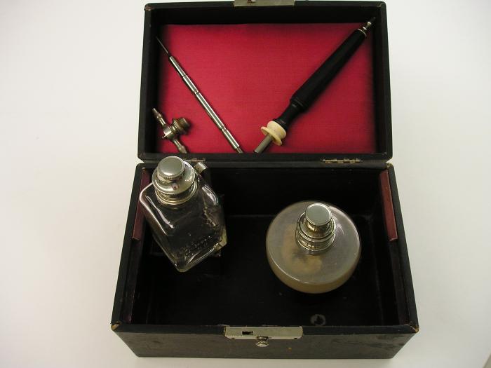 Appareil à cautérisation au platine dans étui de noir gainé de rouge, contenant: - 1 flacon avec bouchon métal marqué “benzinstand” - 1 lampe à alcool avec bouchon métal et mèche coton - 1 manche en ébonite de 16 cm - 1 petit cautère en métal à pointe fine de 13,5 cm, une petite boîte en carton avec des éléments métalliques.