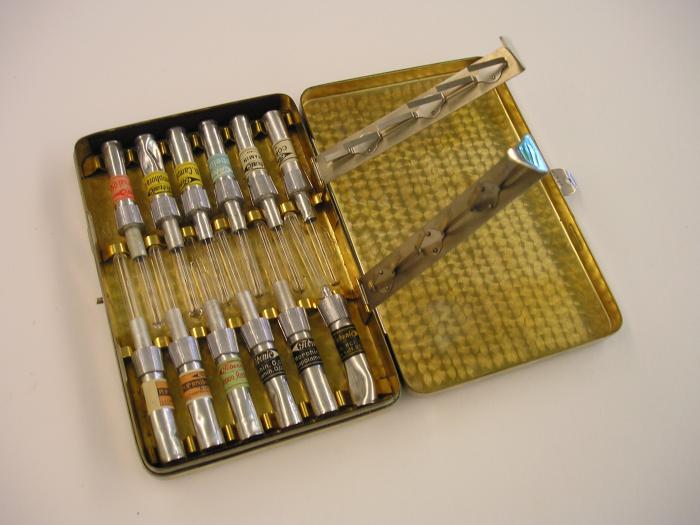 Boîte de métal conteannt 12 ampoules-seringues de divers médicaments