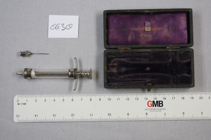 Seringue en métal avec réservoir en verre. Aiguille. Etui.