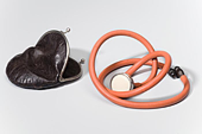 Stéthoscope bi-auriculaire à embout cylindrique, tuyaux de caoutchouc rouge et olives en caoutchouc noir durci dans étui de cuir brun.