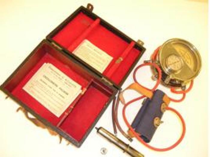 Appareil de mesure de la pression artérielle avec manchette en coton bleu, pompe et tuyaux de caoutchouc rouge dans boîte noire gainée de feutrine rouge. Caissette: Longueur 25 cm - Largeur 18 cm Hauteur 10 cm. Cet appareil a été utilisé par Mme Emilia Mourraille, infirmière-chef de l’Hôpital militaire de Bordeaux durant la guerre de 1914-1918, mère de Mme Laffite.