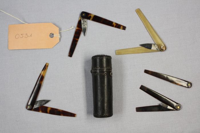 étui cylindrique en métal et cuir, décoré de petits disques métalliques dont beaucoup manquent. 6 lancettes avec manche en écaille, l’une d’entre elles est coincée dans l’étui. Une avec nom “NOBLET”. Une autre avec trèfle dont la tige serpente