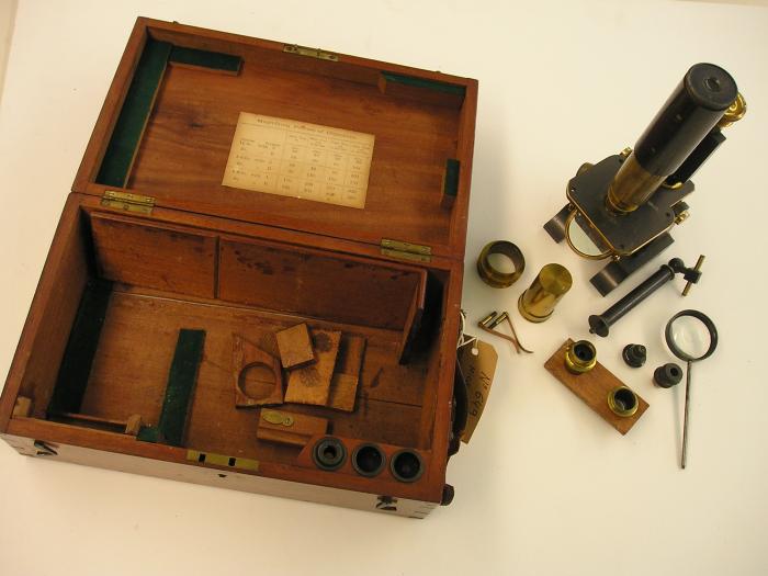 Microscope monoculaire en laiton verni, pied en fer à cheval laqué noir, 3 oculaires, 3 objectifs, 1 loupe, dans caissette en bois d’acajou. Ce microscope a été utilisé par le Prof. Verdan pendant ses études de médecine (années 1930).