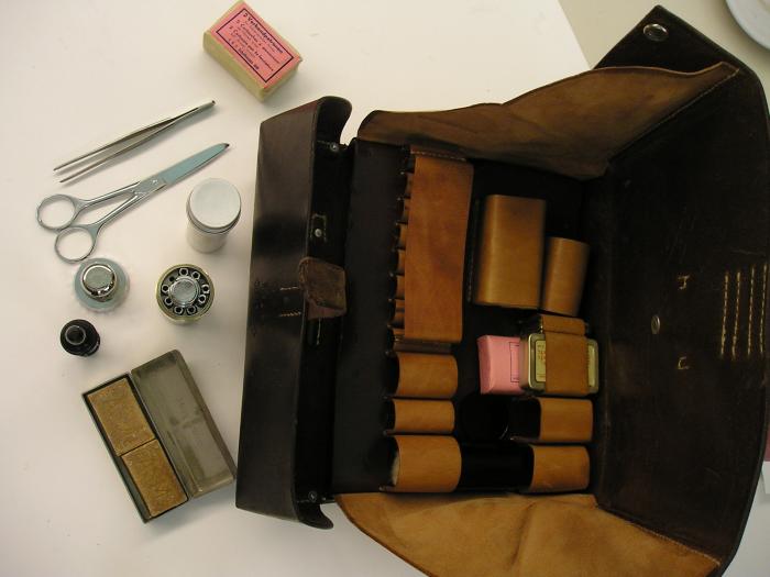 Trousse de cuir brun poortant l’inscription: ASM 16753 Elle contient: 10 instruments + 1 thermomètre dans une trousse de coton crème 1 pincette anatomique 1 paire de ciseaux 1 boîte de métal avec emplâtre adhésif 1 flacon de bakélite noire avec embout, contenant du mercurochrome 1 cylindre de bakélite noire contenant du coton hydrophyle 2 cartouches à pansement 1 bande élastique 12 boîte de compresse de gaze au vioform 1 boîte d’épingles de sûreté 1 cylindre de métal contenant 1 seringue de 2 ml et un choix d’aiguilles 8 petits compartiments à médicaments sont vides