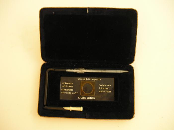 Appareil à compter les globules sanguins d’après le Dr Nageotte composé: - d'une cellule - d’une pipette avec tuyau de caoutchouc noir et embout dans boîte carmin gainée de velours violet.