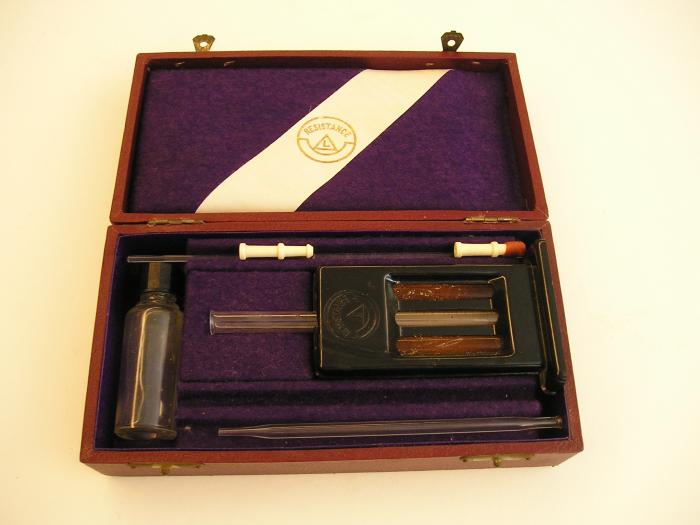 Hémomètre avec accessoires dans boîte carmin gainée de velours violet.