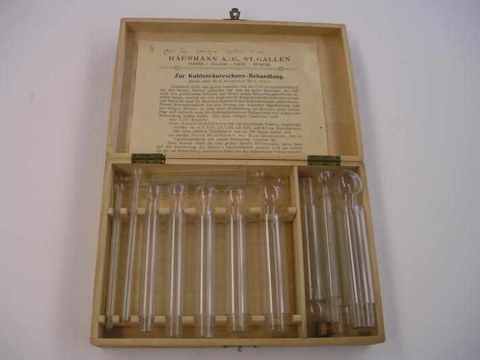 16 tubes de verre de différents diamètres pour l’application de neige carbonique, dans boîte de bois clair: 21 x 15 x 4,5 cm.